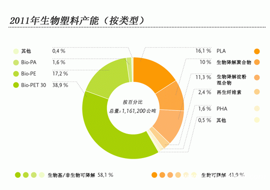 圖2:2011年不同類型的生物塑料的產能(數據來源:歐洲生物塑料協會、漢諾威大學應用科學和藝術學院、IfBB—生物塑料和生物復合材料學會)