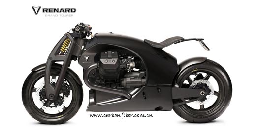The Renard GT’s carbon-fiber monocoque weighs only 11 kilograms, and is reinforced with Kevlar, to make it resistant to impact and vibration. The unibody integrates the motorcycle’s frame, gondolas, petrol tank and air box into a single load-bearing structure. The sleek, no-nonsense exterior gives the Renard its distinctive appearance.