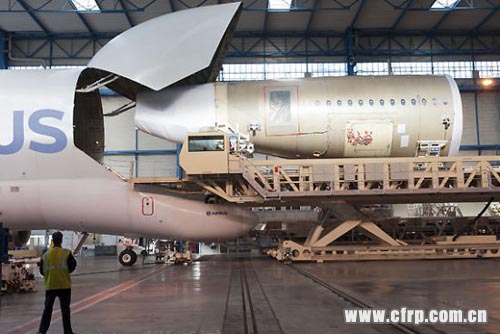 2012年4月25日,用于對A350XWB寬體飛機進行靜態結構測試的飛機后端機身抵達總裝線,空客A350XWB后機身段長20米,采用的是碳纖維復合材料,由機身尾段和四塊后機身蒙皮組成。(如圖)
