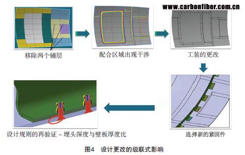 對于設計流程,設計更改是無處不在的,并且是一定會做設計更改的。那么設計更改的影響是什么呢?考慮機身壁板中蒙皮厚度變化和基礎結構位置移動的連鎖影響。圖4說明的是由于簡單的鋪層的變化帶來的一系列的設計更改。