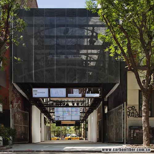 The lower half of the BMW Guggenheim Lab structure is an open space that can be configured to meet the particular needs of the various programs, shifting from a formal lecture setting with a stage to the scene for a celebratory gathering or a workshop. The upper, “toolbox” portion of the structure is loosely wrapped in two layers of semitransparent mesh, which creates a shimmering moiré effect and allows visitors to catch glimpses of the extensive apparatus of “tools” that can be raised or lowered on a rigging system to configure the lower space for the different programs. Remarkably, the BMW Guggenheim Lab is the first building designed with a structural framework composed of carbon fiber. Videos and images of the structure and the construction process can be viewed at youtube.com/bmwguggenheimlab and flickr.com/bmwguggenheimlab.