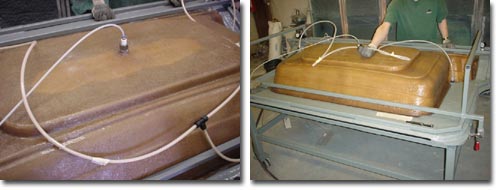 模具是這兩種工藝的最大差別,在RTM投資中,由于注射壓力大,相當部分的成本花在模具和夾緊裝置上。這樣對于產量少的產品在價格上是不適合的。RTM工藝模具使用壽命可達5000件以上,生產效率高,適合年產2000件以上的產品。