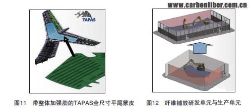 雙曲面、7m 長的扭力盒是作為TAPAS 項目的一部分開發的,將于2011 年制造并驗證完畢。該產品是對灣流G650 平尾中段重新設計的產物(圖11),其蒙皮的特點是整體對接T 形加強筋。研究還在繼續,以便確定熱壓罐外成型是否可行。纖維鋪放因其在鋪疊過程中對材料的浪費最少而成為首選的鋪疊技術。蒙皮鋪疊將采用專業化的纖維鋪放設備單元。該設備單元將安裝GTech的Vericut 復合材料程序模塊,以便將CATIA 設計與機械手軟件鏈接起來。該設備單元只需少量投資即可開發,滿足成批量生產12m 全尺寸蒙皮壁板的需求(圖12)。