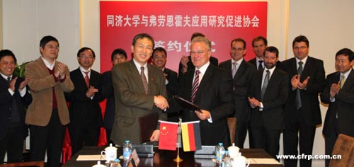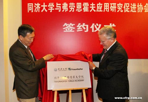 雙方簽署了《同濟(jì)大學(xué)和弗勞恩霍夫應(yīng)用研究促進(jìn)協(xié)會戰(zhàn)略合作協(xié)議》,并共同為合作成立的“同濟(jì)大學(xué)——弗勞恩霍夫?qū)W院”揭牌。此外,同濟(jì)大學(xué)校長助理、汽車學(xué)院院長余卓平教授和弗勞恩霍夫制造技術(shù)和應(yīng)用材料研究所(IFAM)Busse教授,校長助理、材料學(xué)院院長吳廣明教授和弗勞恩霍夫建筑物理研究所(IBP)Hauser教授在雙方戰(zhàn)略協(xié)議框架下,又簽署有關(guān)電動汽車和建筑材料測試領(lǐng)域的兩個合作備忘錄。根據(jù)合作備忘錄,“同濟(jì)大學(xué)——弗勞恩霍夫?qū)W院”的首個項(xiàng)目將在電動汽車領(lǐng)域啟動,與材料領(lǐng)域相關(guān)的備忘錄則涉及共同建立一個建筑材料野外試驗(yàn)基地。