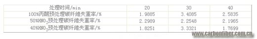 采用經(jīng)過100%丙酮、50% HNO3、40%HNO3浸泡120分鐘的碳纖維,在過磷酸銨配制的溶液中進行處理。處理后碳纖維的失重率見表4。