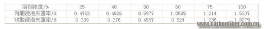 采用丙酮、硝酸作為溶劑進行浸泡,不同濃度條件下,碳纖維浸泡后的失重率見表2。