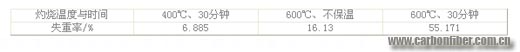 采用在空氣中進行灼燒的方法,分別在400℃保溫30分鐘,升溫至600℃不保溫和升溫至600℃保溫30分鐘。碳纖維失重率見表4。
