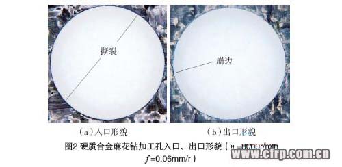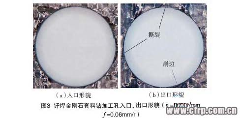 圖2為硬質合金麻花鉆加工孔的入口和出口形貌。如圖2所示,入口形狀規則、無毛刺,但出現較大撕裂缺陷,質量較差;出口形狀規則,無毛刺,但出現小范圍崩邊,質量較好。圖3為釬焊金剛石套料鉆加工孔的入口和出口形貌。如圖3所示,入口形狀非常規則、無毛刺、無撕裂,質量較優;出口形狀規則、無毛刺,但部分區域出現撕裂和崩邊缺陷,質量較差。