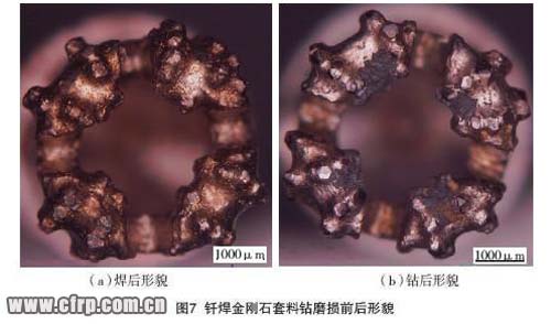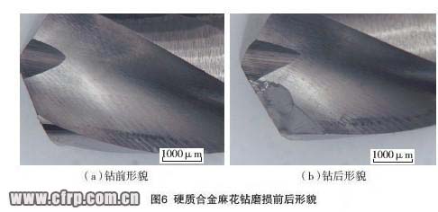 硬質合金麻花鉆的耐磨性較差,使用壽命較短。而釬焊金剛石套料鉆的耐磨性較強,使用壽命較長,是加工CFRP 材料良好刀具。
