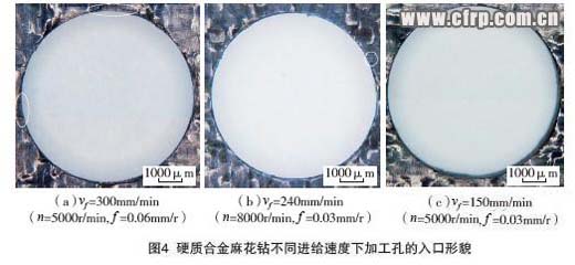 圖4為不同進給速度vf下硬質合金麻花鉆加工孔的入口形貌圖。從圖4(a)~(c),進給速度分別為300mm/min、240mm/min及150mm/min,孔入口形貌分別為出現較大撕裂、有崩邊無撕裂、無缺陷。由此可見,硬質合金麻花鉆加工CFRP 時,進給速度240mm/min 為一個臨界值,當進給速度大于該值時,將會出現撕裂缺陷;當進給速度小于該值時,無撕裂產生,得到好的孔入口質量。