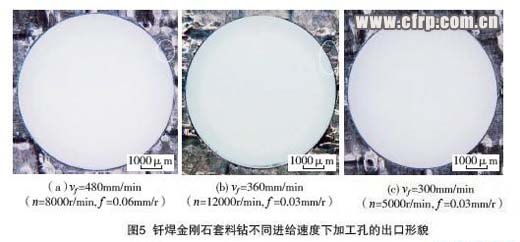 圖5 為不同進給速度vf 下釬焊金剛石套料鉆加工孔的出口形貌圖。從圖5(a)~(c),進給速度分別為480mm/min、360mm/min 及300mm/min,孔入口形貌分別為出現較大撕裂、有崩邊無撕裂、無缺陷。如圖5所示,釬焊金剛石套料鉆加工CFRP時,臨界進給速度為360mm/min。