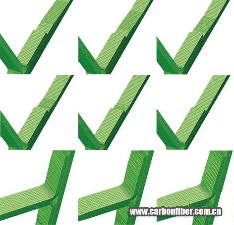 自動建模算法須能根據一系列給定的幾何參數和鋪層參數,為接頭內每一鋪層(包括插層)和每一填充區(qū)構建合理的分析網格,同時滿足各鋪層網格相互結合部的節(jié)點共有要求。此外,需能準確構建每個單元的材料坐標系。圖4給出通過專門設計的算法,在模擬接頭突緣和突緣區(qū)底板內部增減插層對承載能力影響作用的計算過程中,自動生成了部分模型示意圖。