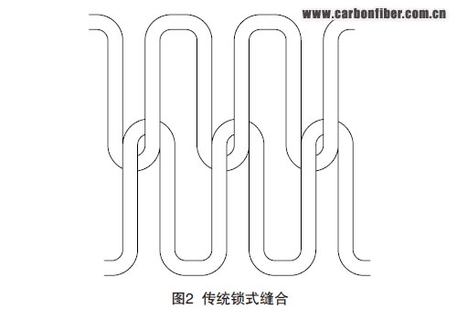雙面縫合是從預制體的上下兩面進行縫合,其原理與家用縫紉機的原理相似,縫合線被針從制件一邊帶入,底下有一底梭配合縫針帶線結套。這種縫合方式的縫合線軌跡如圖2所示。
